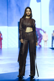 Mahogany leather effect chiffon cropped blazer with "Humans of ESSÉ" embroidery.